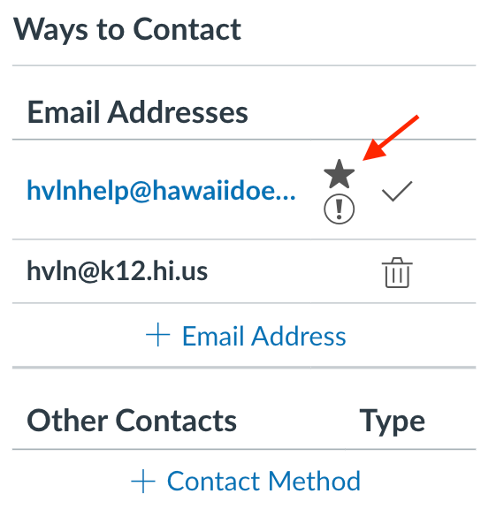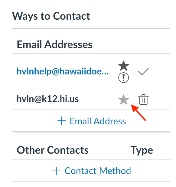 2. In the Ways to Contact sidebar at the right, under Email Addresses, there is a star icon next to the default email address.